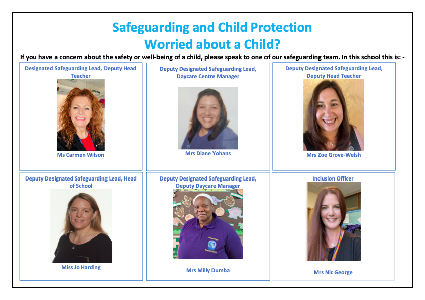 Our Deputy Safeguarding Leads are – Jo Harding, Nic George, Zoe Grove- Welsh, Diane Yohans and Milly Dumba