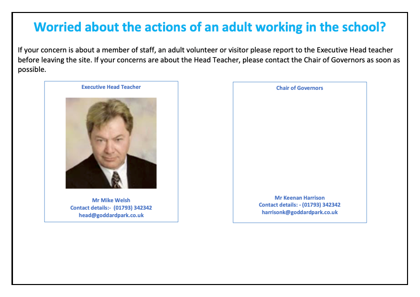 Goddard Park Primary School and Daycare Centre is committed to the promotion of welfare and safeguarding of all children and expects all staff and visitors to share this commitment.